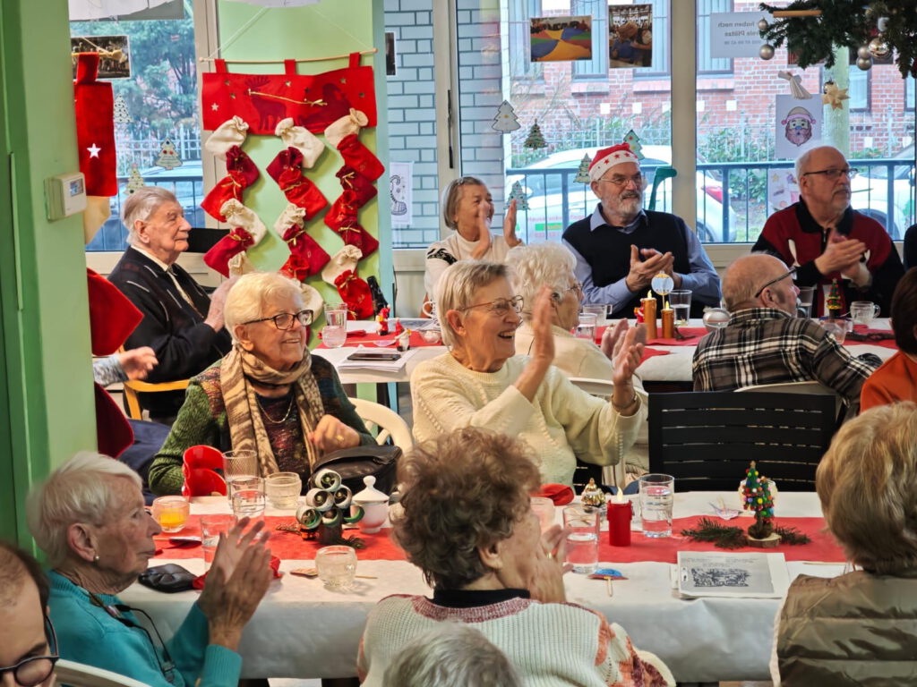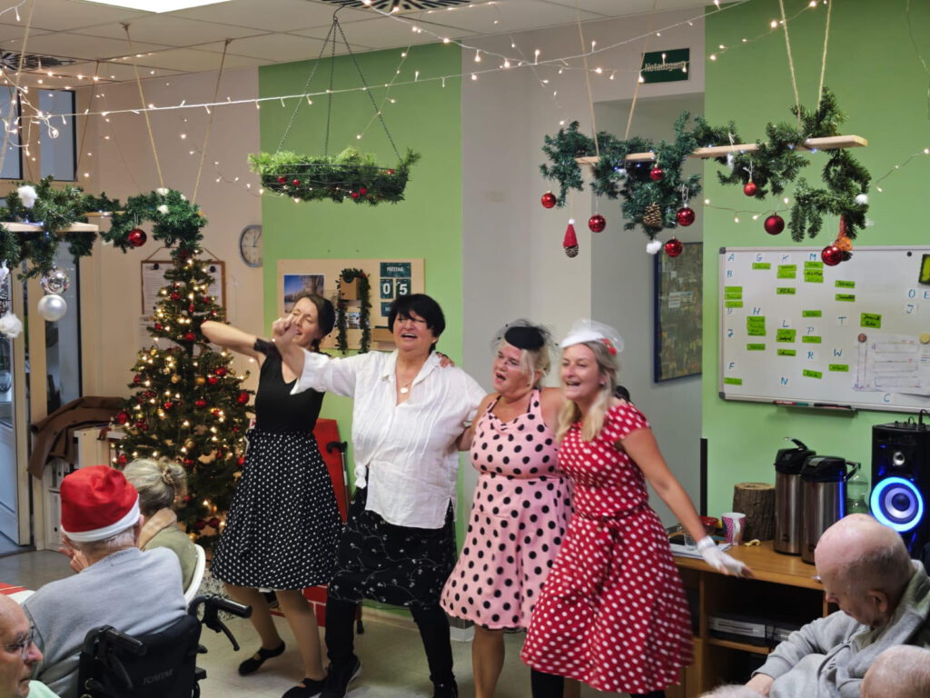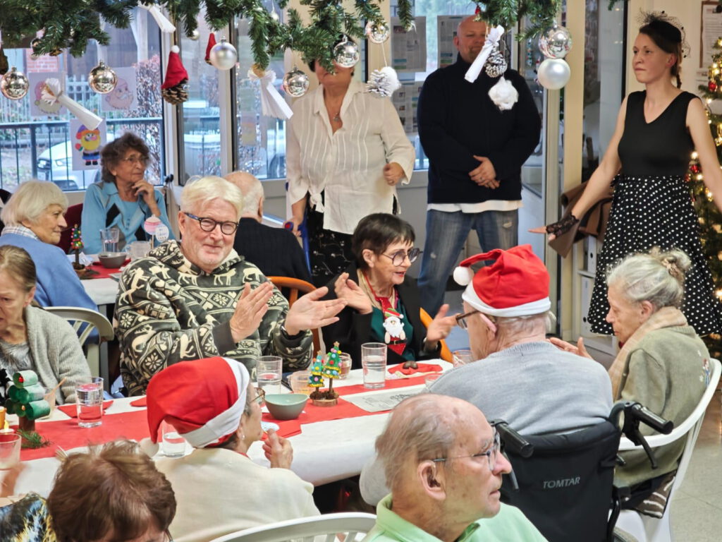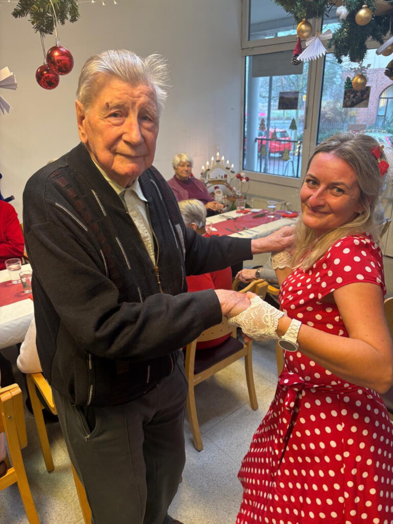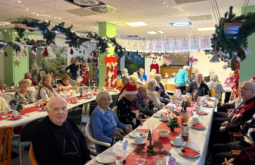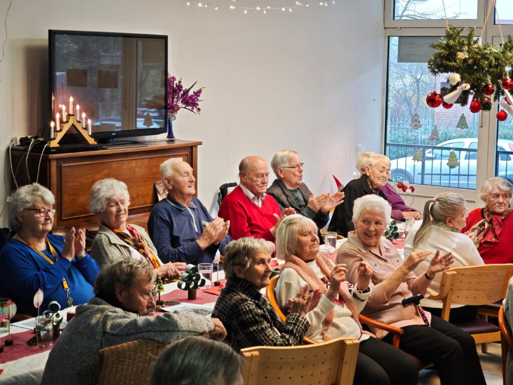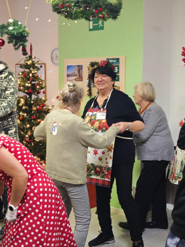 Am vergangenen Freitag haben wir mit unseren Gästen ein stimmungsvolles und fröhliches Weihnachtsfest gefeiert. Der Saal war voll: mit 60 Gästen haben wir gesungen, getanzt und gelacht. Einige Mitglieder des Kirchenchores aus Schmöckwitz waren zu Besuch und haben mit uns festliche Lieder gesungen. Die Mitarbeiter der Tagespflege hatten anschließend wieder ein abwechslungsreiches Programm vorbereitet: einen Sketch, eine Tanzshow zu Musik aus 50er / 60er und 70er Jahren und gemeinsames Singen mit Instrumenten. Unsere Gäste waren begeistert und konnten es kaum erwarten, als dann endlich der Weihnachtsmann kam – begleitet von seinen Engeln. Neben dem tollen Programm durfte auch ein besonderes Menu an diesem Tag nicht fehlen. Schon zum Frühstück gab es reichlich belegte Wurst und Käse Platten, Schmalzstullen, Eier und Lachsbrötchen. Das Mittagessen mit Kassler, Grünkohl, Rotkohl, Kartoffeln und Klöße ließ keine Wünsche offen, gefolgt von einem weihnachtlichen Dessert mit Spekulatius. Zum Abschluss haben wir dann einen leckeren Stollen zum heißen Kaffee serviert. Es war ein rundum gelungenes Fest mit vielen schönen Momenten und fröhlicher Stimmung.