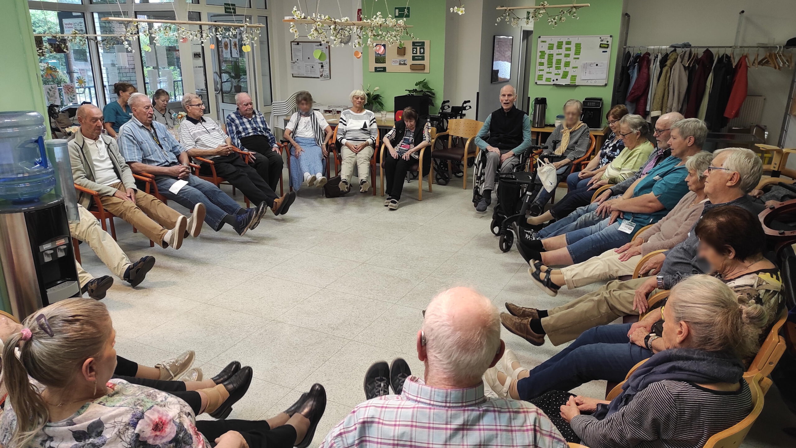 Ab 10 Uhr startet dann unser Programm, mit Stuhlgymnastik, Gedächtnistraining, singen, individuell nach der Jahreszeit, Monat und Tag.
