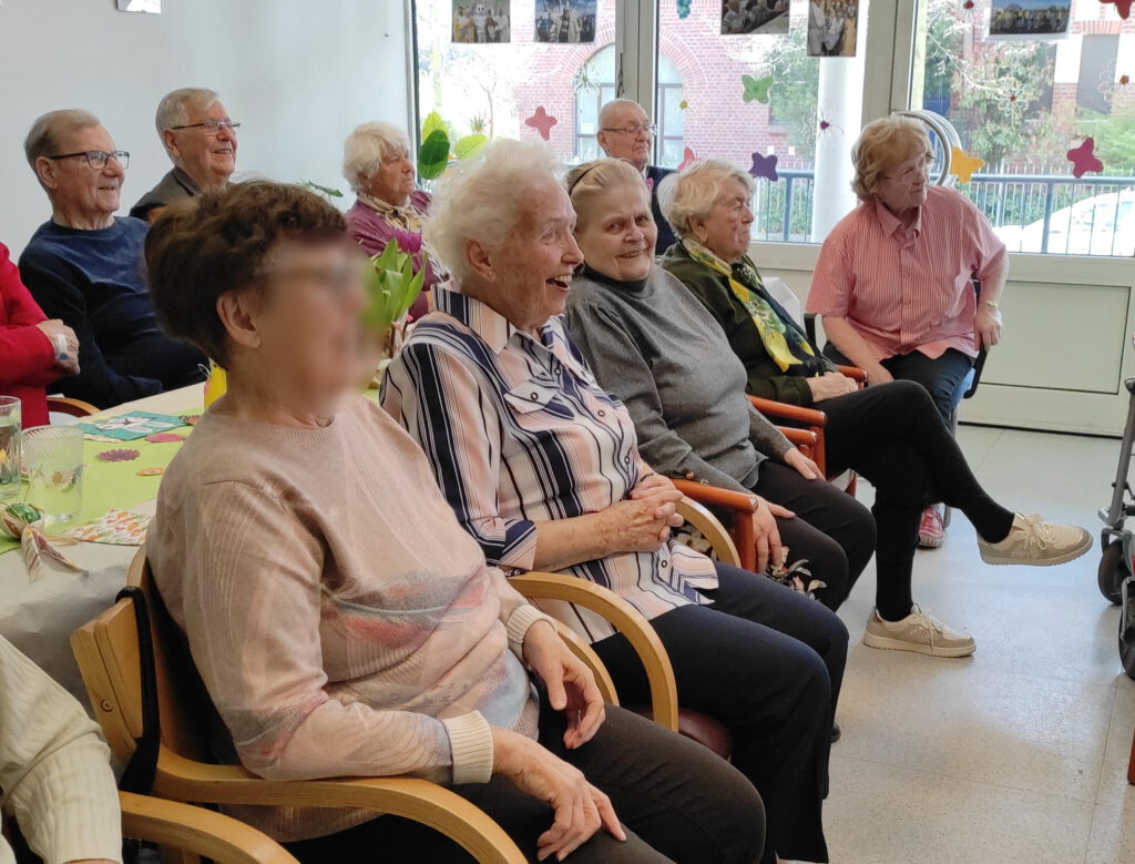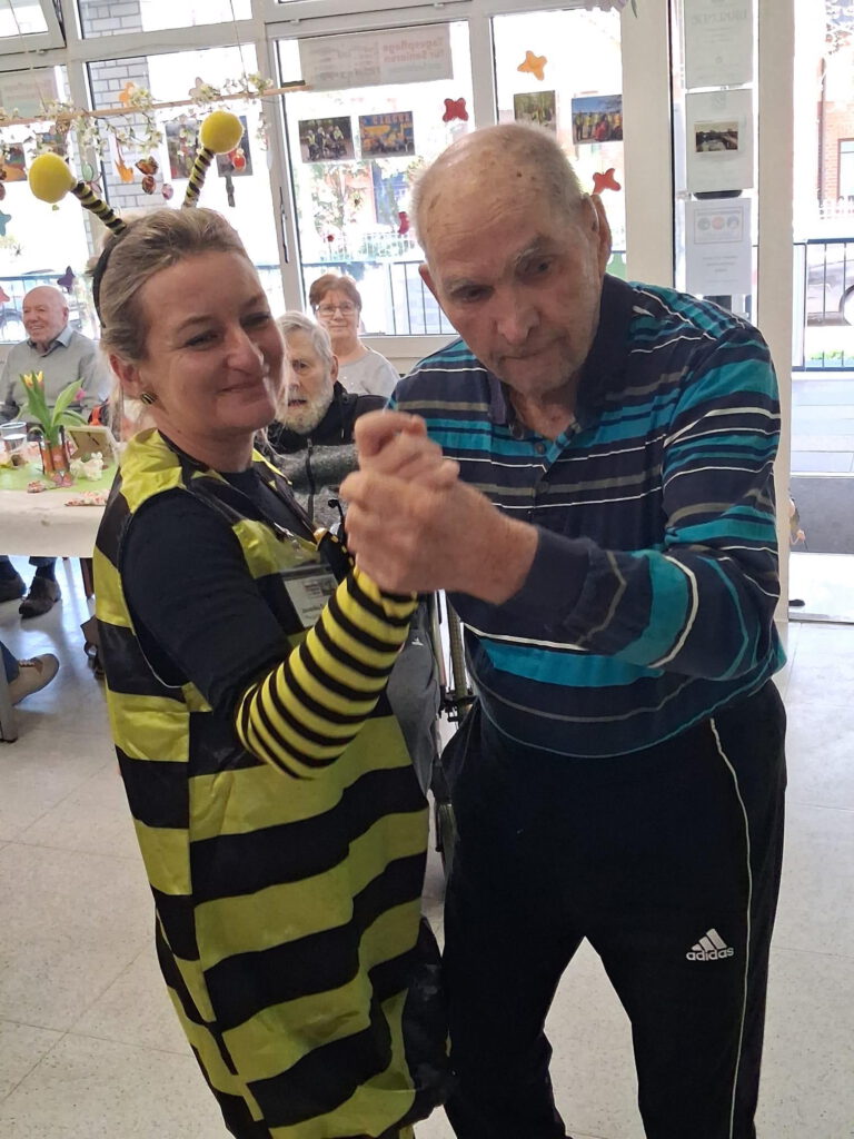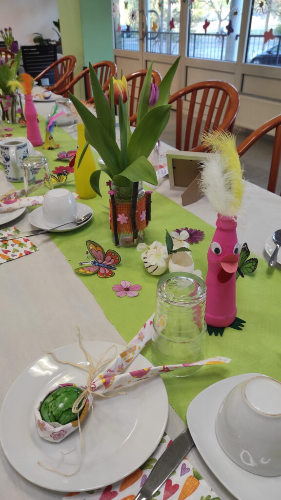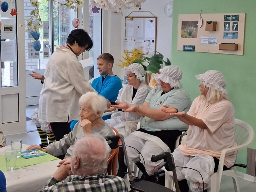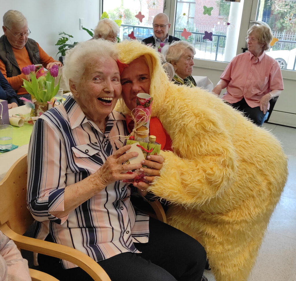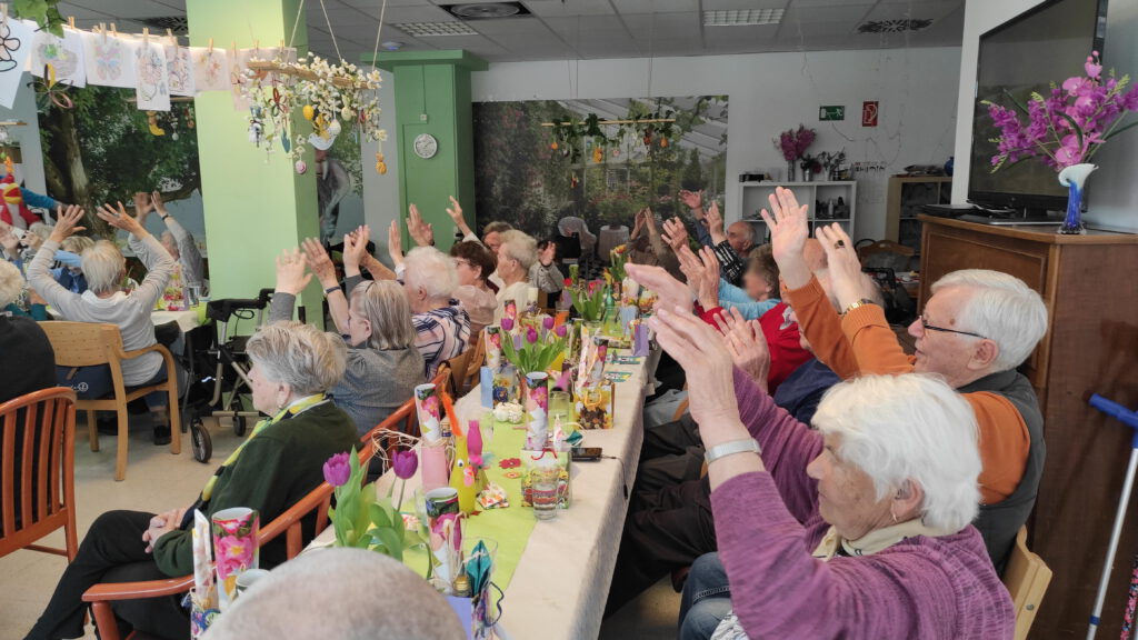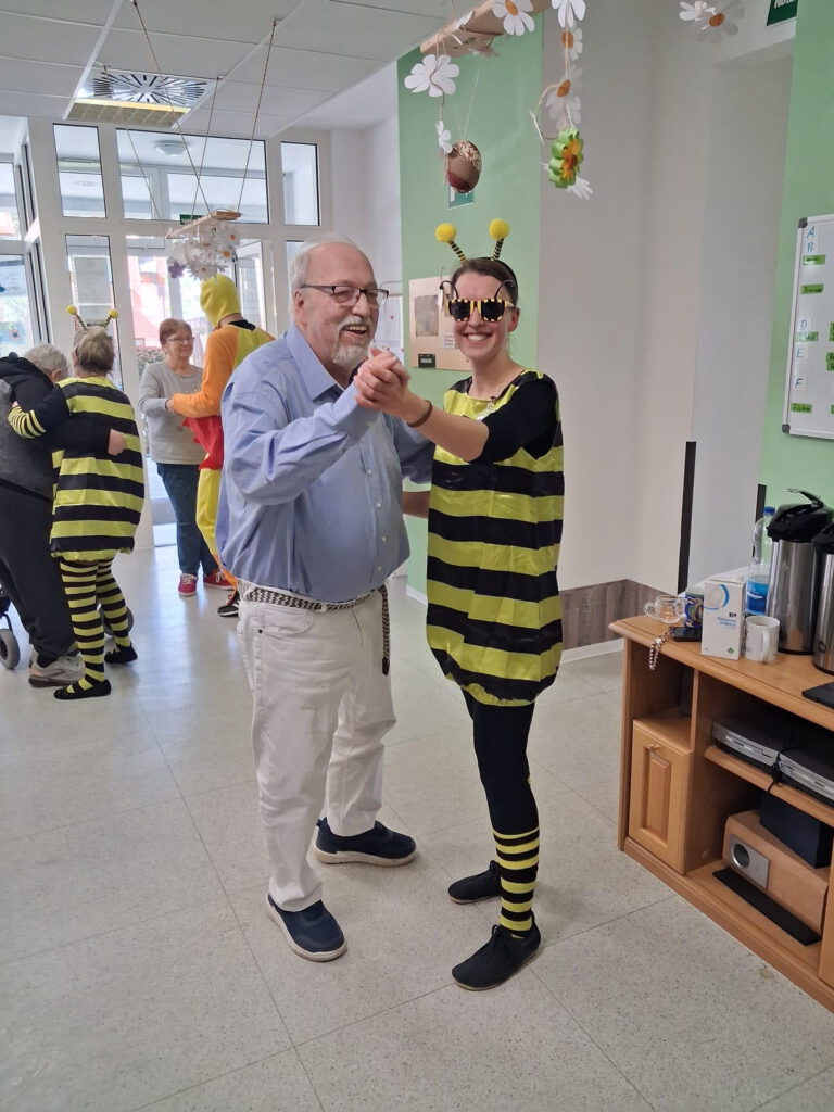 Am vergangenen Freitag haben wir unser Frühlingsfest gefeiert mit Tulpen, Bienen, Schmetterlingen, Hasen und Küken. Wir haben – wie immer – ordentlich das Tanzbein geschwungen. Selbst Gäste, die im Rollstuhl sitzen, sind auf unseren Festen so motiviert und stehen auf um ein paar Schritte zu tanzen. Es wurde geschunkelt und gesungen: Frühlingslieder, Schlager und Berliner Lieder – für jeden war etwas dabei. Das Team der Tagespflege am Seddinsee hatte wieder viele Programmpunkte vorbereitet. Dazu gehörten Sketche, Tänze, Spiele und Gedichte. Auch das Essen ließ keine Wünsche offen: ein großes Frühstücksbuffet mit gefärbten Eiern, Lachs- und Mettbrötchen; ein üppiges Mittagessen mit Kartoffeln, Spargelgemüse und Schnitzel; zum Nachtisch einen großen Schwedeneisbecher; zum Kaffee ein großes Stück Schwarzwälder Kirschtorte. Und ganz zum Schluss kam natürlich noch der Osterhase vorbei und hat Geschenke da gelassen. Unsere Gäste strahlten und gingen mit einem Lächeln nach Hause.