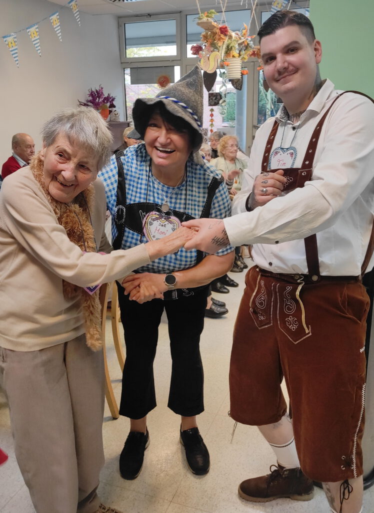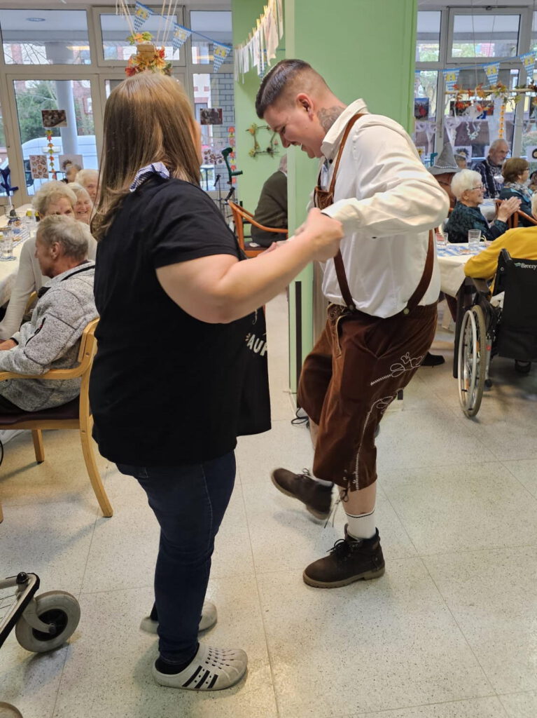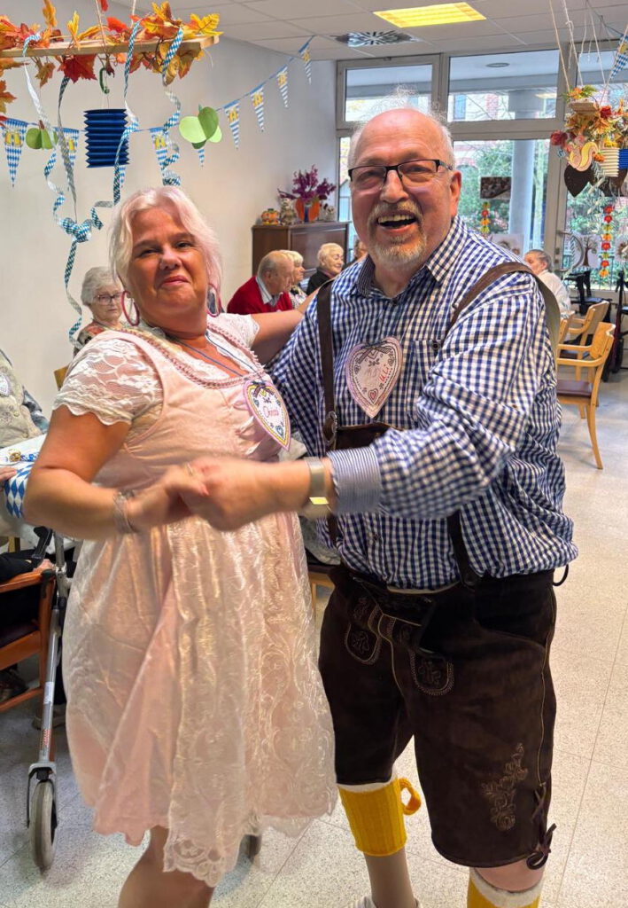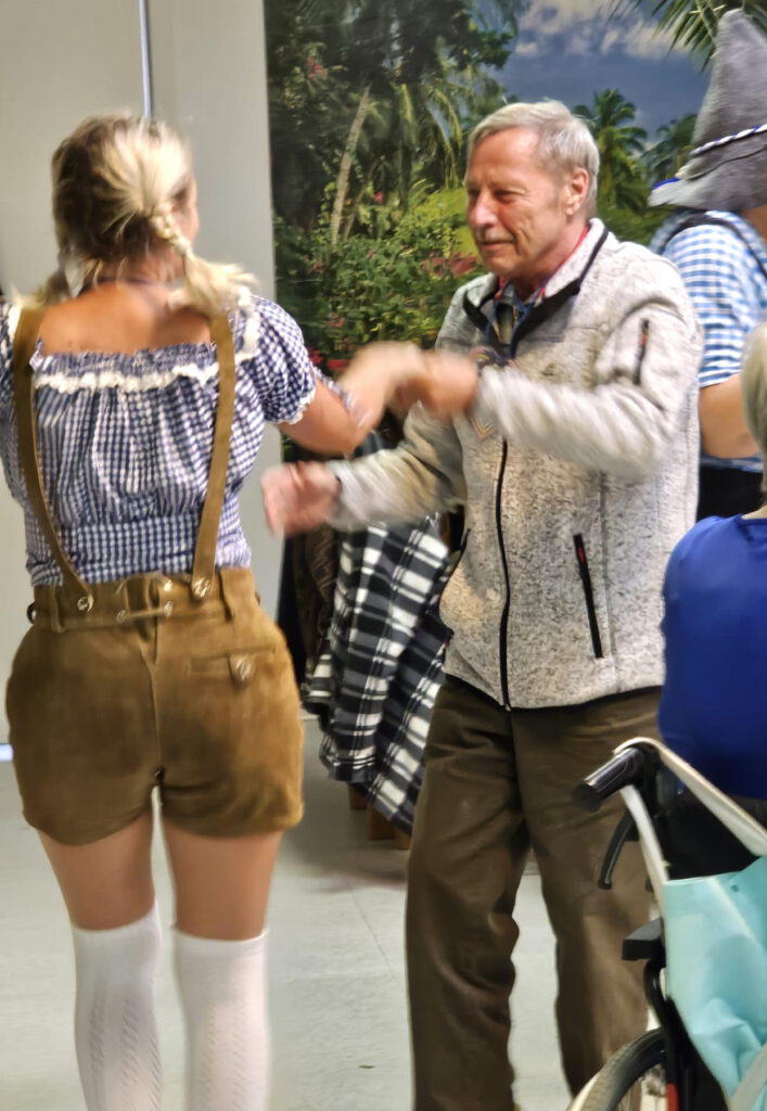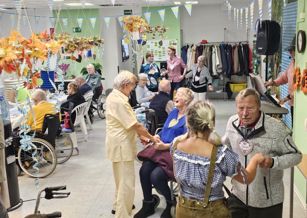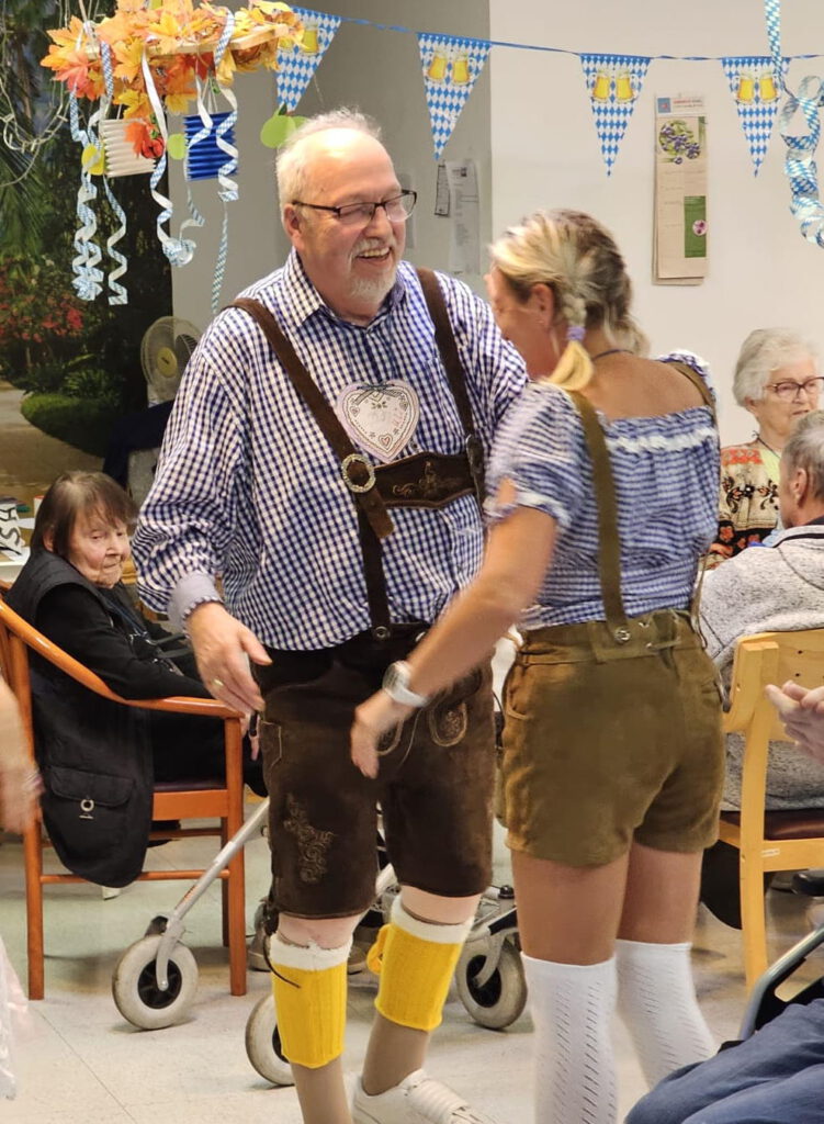 Wie jedes Jahr hat sich unsere Tagespflege für einen fröhlichen Tag in ein kleines Stück Bayern verwandelt. Wir haben unser Oktoberfest gefeiert, mit allem was dazu gehört: Dirndl, Lederhosen, Bier und Brezeln. Unser Musiker Olli hat wieder für super Stimmung gesorgt und unsere Gäste von den Stühlen geholt. Nach einem schwungvollen Vormittag mit Bier und Brezeln, folgte ein echt bayerisches Mittagessen mit Leberkäs, Kartoffelsalat und Bayrischer Creme. Ein besonderes Highlight in diesem Jahr war die Tanzeinlage des Teams, das extra für diesen Anlass einen bayerischen Volkstanz einstudiert hat.